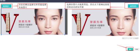 1. 点击“+”,添加活动图片,“选择图片”并拉取合适的尺寸,点击“裁减预览”后并确认;