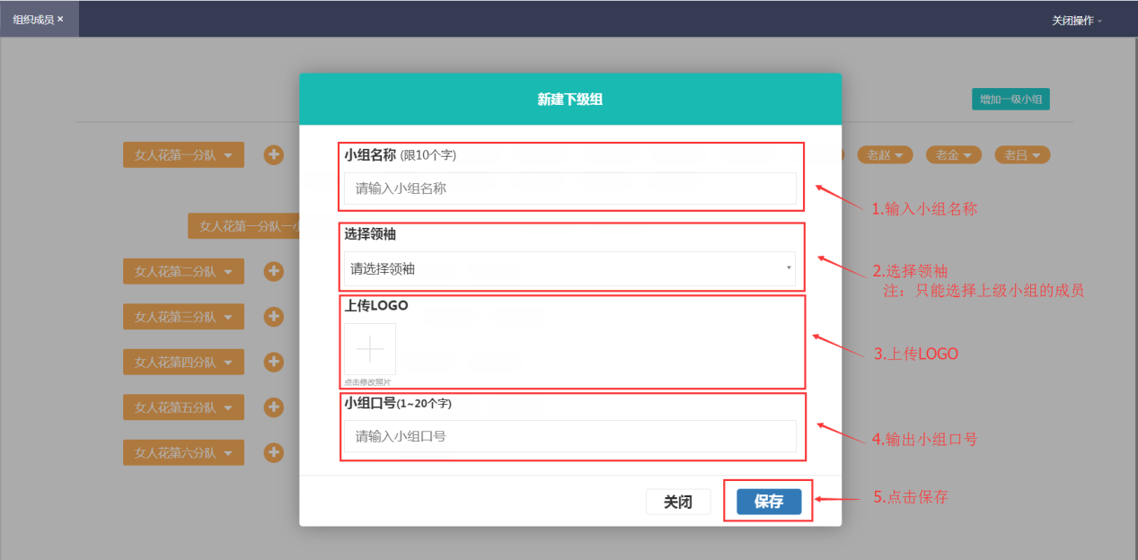 - 创建小组分为【创建一级小组】和【创建下级小组】,如下图: