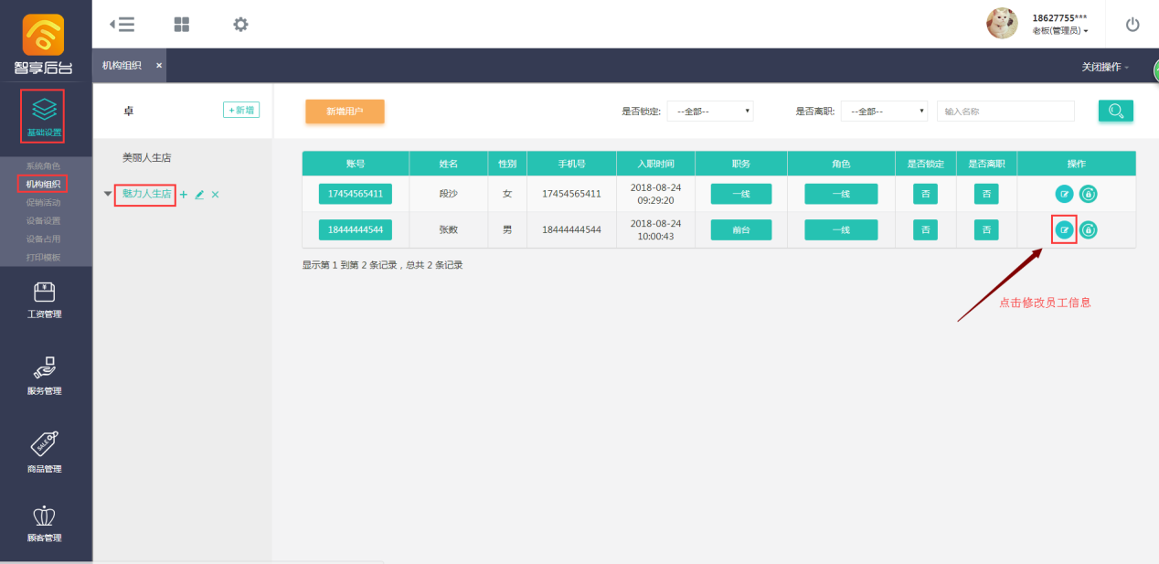 点击员工账号,可以查看员工详细信息