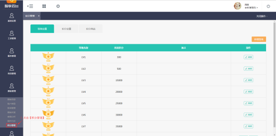 点击左侧的【顾客管理】——【积分管理】,进入“积分管理”页面,可以查看已设置的积分等级