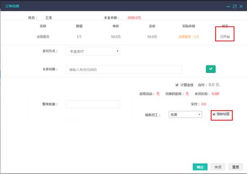 - 如果服务状态显示未完成,点击“确定”会提示“服务未完成不能结算”。这时如果勾选下方的“强制结算”,也可以强行完成订单,相应的服务工单状态将被强制修改为已完成。顾客的卡项次数也会自动扣减。