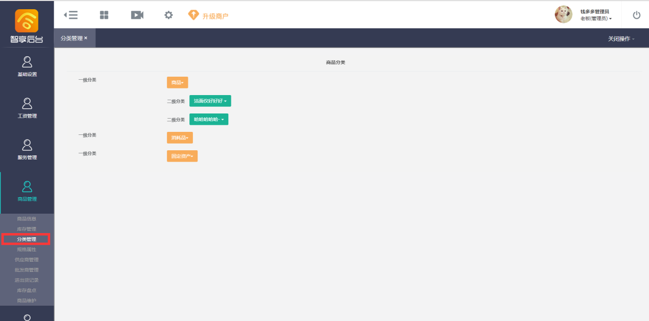 - 点击“分类管理”进入商品分类管理界面