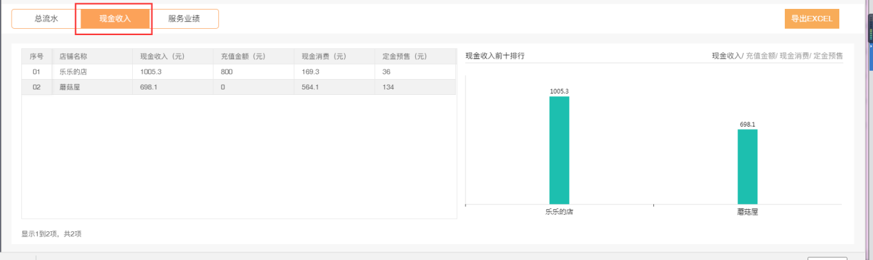 - 在“现金收入”栏,点击右侧的导出excel按钮,可以导出所有店铺的现金收入数据