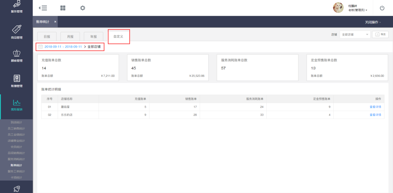 - 点击自定义,输入开始时间和结束时间,可查看该时间段全部店铺的账单统计情况