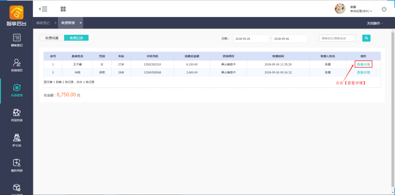 5)点击【收费记录】,进入“收费记录”页面,可以查看到刚刚收费完成的顾客信息;也可以通过日期、顾客姓名/电话号码进行搜索查看已经收费的顾客信息