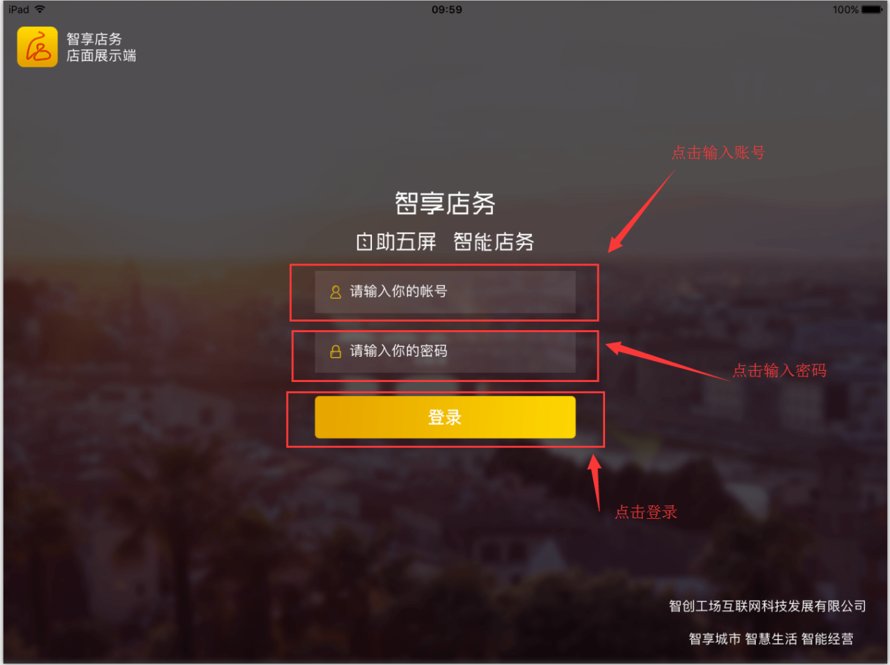 - 点击智享店务app在输入框输入账号,密码,点击登录按钮;