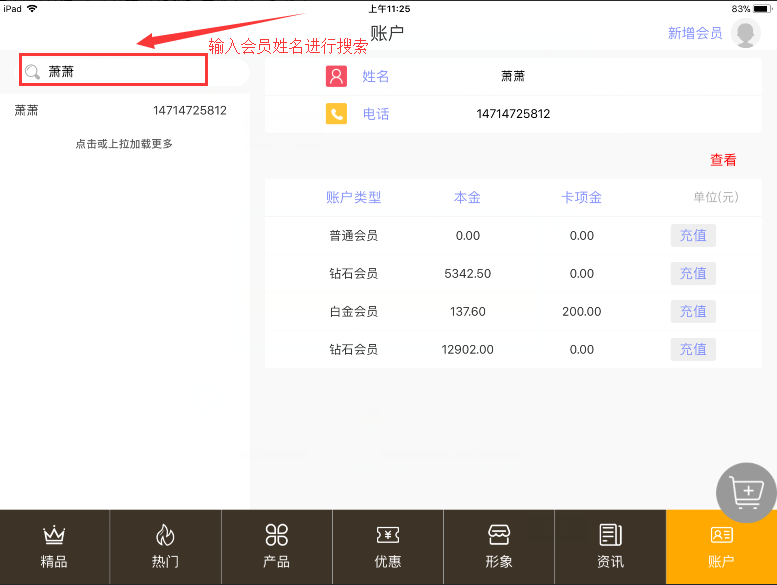1. 在搜索框中输入会员名字,进行搜索