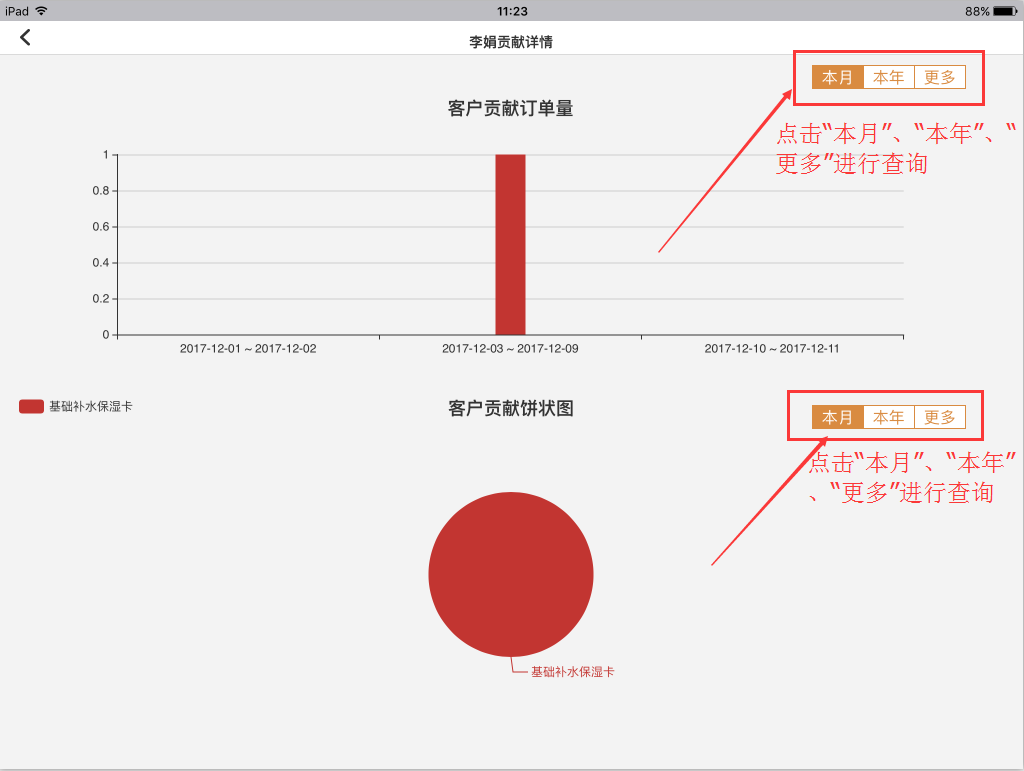 - 点击列表中的任一数据,进入该客户贡献详情页面,点击“本月”、“本年”、“更多”可根据年、月、日对应查询客户贡献订单量及客户贡献饼状图。