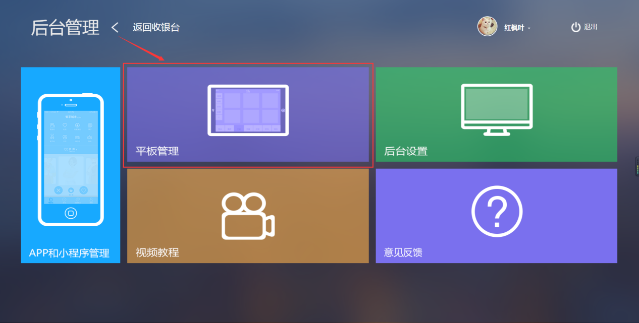 - 进入智享后台的“收银台”页面,选择“后台管理”—“平板管理”。