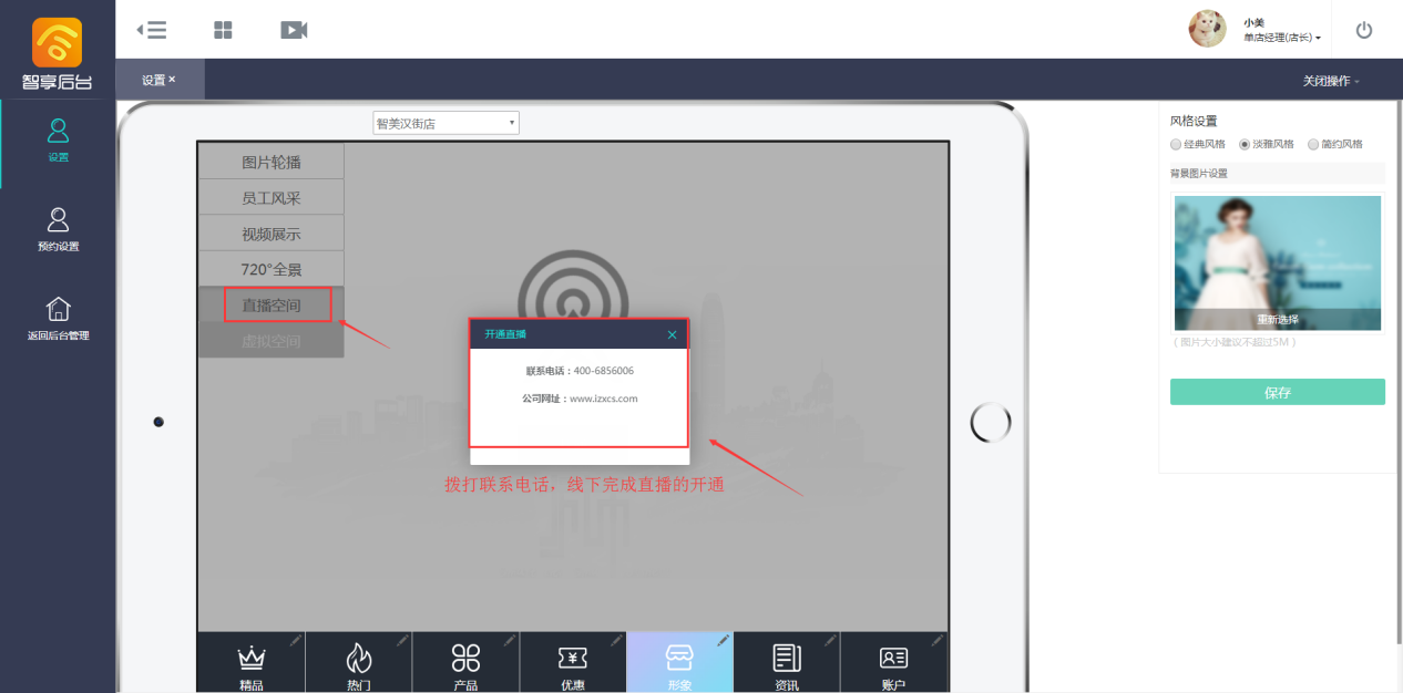 平板pad端可帮助您店面快速进行店内直播,让您的店面形象得到充分的展示,并实时宣传,轻松完成店面锁客。