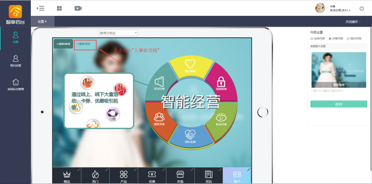 平板pad端可快速帮助您店面完成人事客项钱的查看、发布、编辑,实现店面智能化经营。