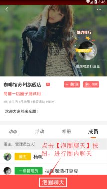 - 在圈子详情页面,点击【成员】,可以查看成员以及进行泡圈聊天