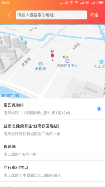 - 在“搜索”页面,搜索文本框中输入“星巴克”,点击【搜索】按钮,搜索出相关地点