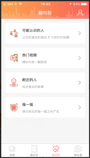 在“趣相投”界面,点击右上角“添加好友图标”按钮,进入“添加朋友”界面