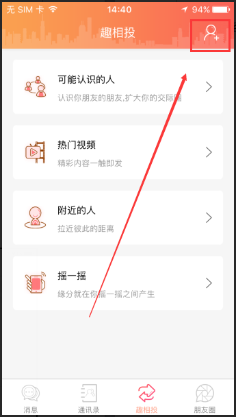 在“趣相投”界面,点击右上角“添加好友图标”按钮,进入“添加朋友”界面