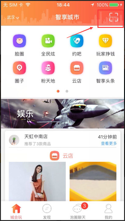 1.点击“智享城市”首页下方的“泡圈聊天”按钮,进入泡圈聊天界面