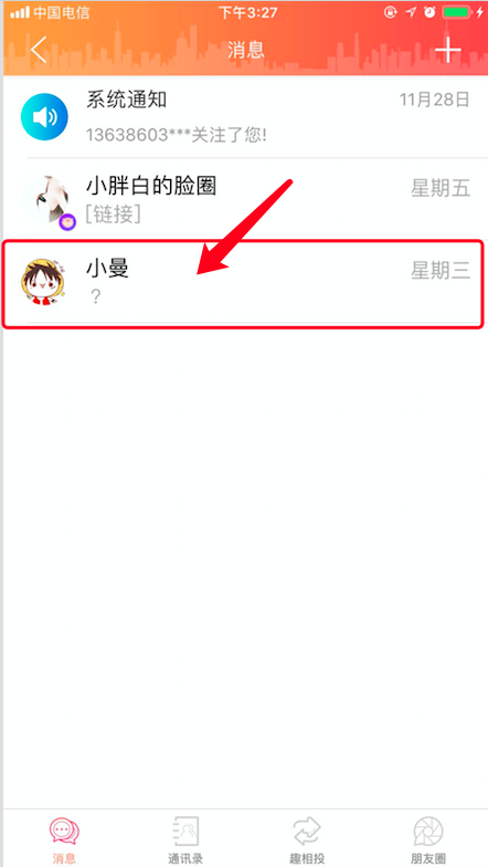 进入“泡圈聊天”模块消息界面后,可以看到如下截图,点击下方的“通讯录”按钮进入“通讯录”界面。