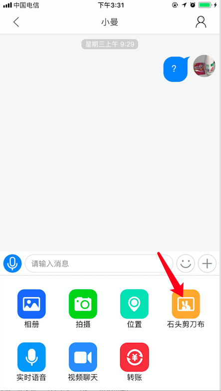 6.进入“聊天”界面后,点击右下角“加号”按钮,底部弹出工具栏,点击下图的“石头剪刀布”按钮即随机发送了一个手势,通过对比来进行猜拳游戏。
