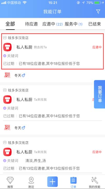 1. 我能订单中有四种状态 待应邀 应邀中 服务中 已结束,每种状态下点击某个订单都可以进入订单详情页面。