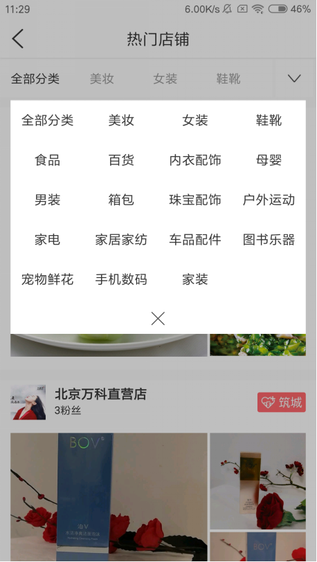 点击右上方“箭头”按钮,展开店铺分类,选择某分类,查看该分类下的热门店铺