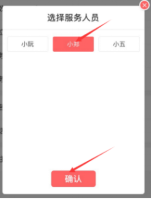 7.设置服务人员:点击服务人员文字提示区域,弹出单选框,点击所需服务人员,点击“确定”按钮,设置完成;