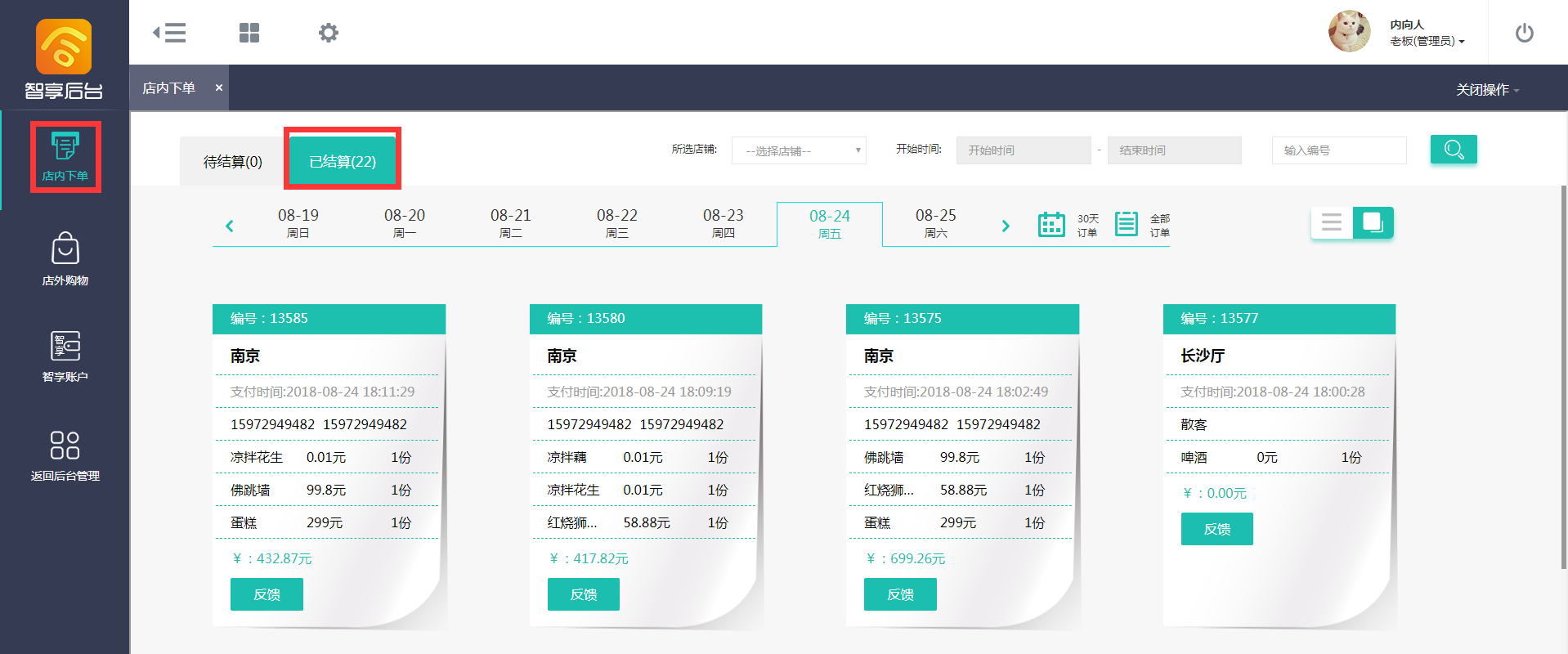 - 店内订单,查看客户的订单情况(先付款后用餐,显示的只有付款的订单,没有付款的订单后台不显示)
