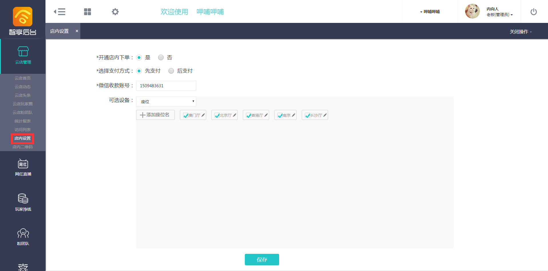 - 店内设置,有2中选择,一个是先支付(先付款后用餐),另外一个是后支付(先用餐后付款),我们这里选择后支付(先用餐后付款),填写微信收款账号,点击保存